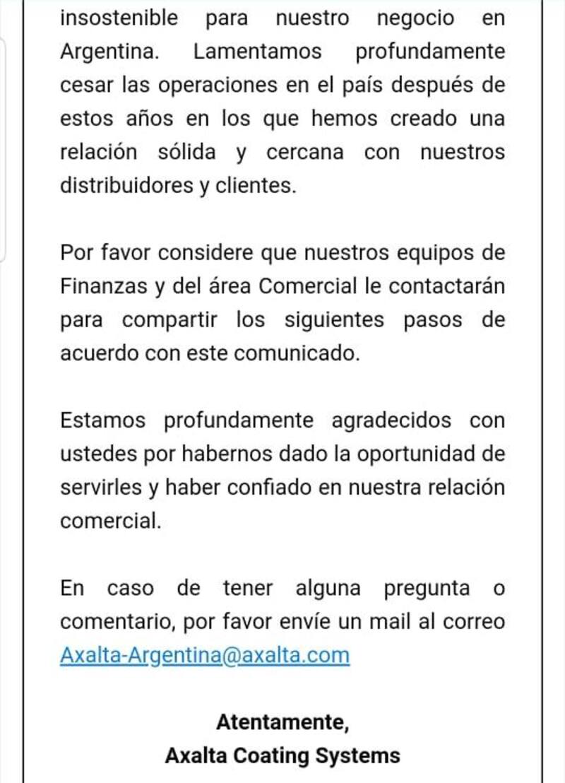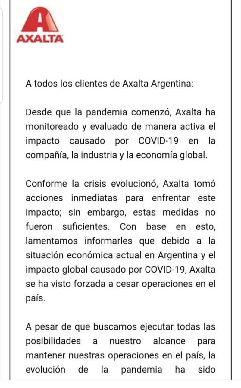 "Con base en esto,lamentamos informarles que, debido a la situación económica actual de la Argentina y el impacto global causado por el Covid-19, Axalta se ha visto forzada a cesar las operaciones en el país. A pesar de que buscamos ejecutar todas las posibilidades a nuestro alcance para mantener las operaciones en el país, la evolución de la pandemia ha sido insostenible para nuestro negocio en la Argentina", continúa el texto, publicado en el portal especializado Argentina Autoblog. Ante la consulta de este medio, la empresa desestimó ampliar la información.