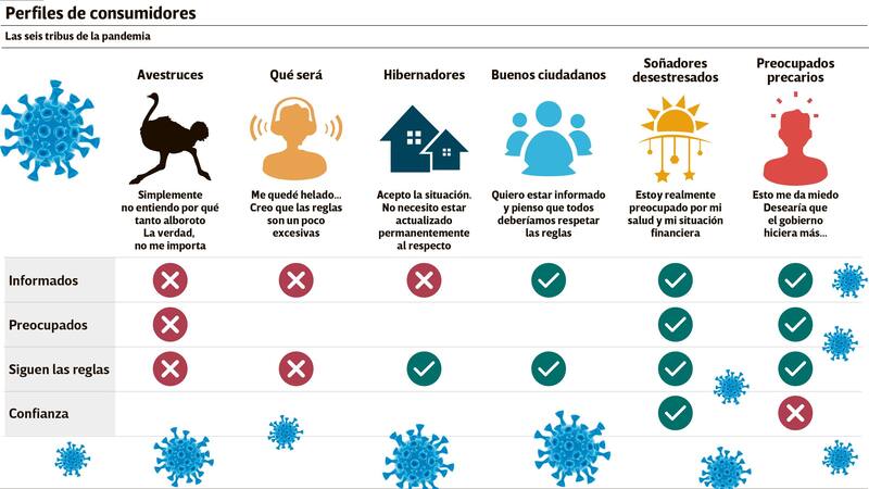 El estudio de Kantar "Barómetro covid-19", realizado en 20 países, reveló seis tribus de consumidores con hábitos, intereses, preocupaciones y realidades similares, que muestran diferentes prioridades y reacciones ante lo que esperan de las marcas en este escenario. Así, elaboró los perfiles a los que las marcas deben estar atentas.