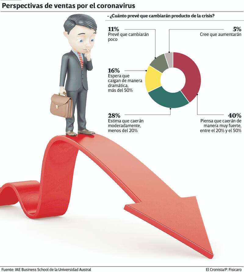 Solo un 5% de los encuestados prevé que las ventas de sus empresas aumentarán. Un 84%, en cambio, estima una caída, aunque no todos piensan que les impactará por igual: mientras que un 16% de ese total calcula que el volumen de comercialización de sus productos y servicios se reducirá de forma "dramática" (más del 50%), un 40% cree que bajarán "fuertemente" (entre un 20% y un 50%) y un 28% considera que el descenso será "moderado" (menos del 20%). En tanto, hay un 11% que, sin dar muchas precisiones, se limita a afirmar que "cambiarán poco".