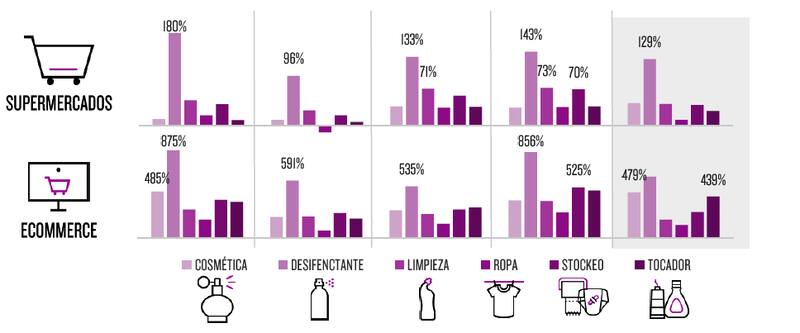 La categoría “desinfectantes la integran antisépticos, insecticidas, jabón de tocador y lavandina entre otras. En los portales estas categorías también crecieron todas las semanas analizadas. En la primera la evolución fue de 875%, 591% la siguiente, la tercera 535%, la de pascuas 856% y la quinta 479%.