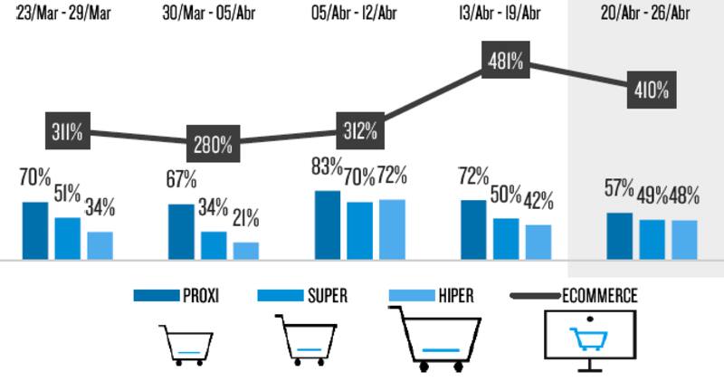 Los formatos más pequeños fueron los preferidos para las compras de reposición. Todas las semanas trackeadas tuvieron crecimiento por encima de la inflación. Apenas declarada la cuarentenasus ventas subieron a 70%, la segunda semana de abril fue la de mejor performance con 83% de crecimiento. E inclusive la semana de Pascuas, en estos formatos que poco desarrollan esas categorías estacionales, tuvo incrementos de 72%.