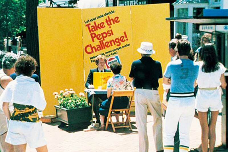 En 1975, Pepsi lanzó el llamado "desafío Pepsi", en donde la firma derrotó a su competidor con una prueba de los dos sabores de gaseosa, totalmente ciego, en el que las personas tenían que probar dos vasos sin etiqueta con cada uno de los contenidos de las marcas dentro.