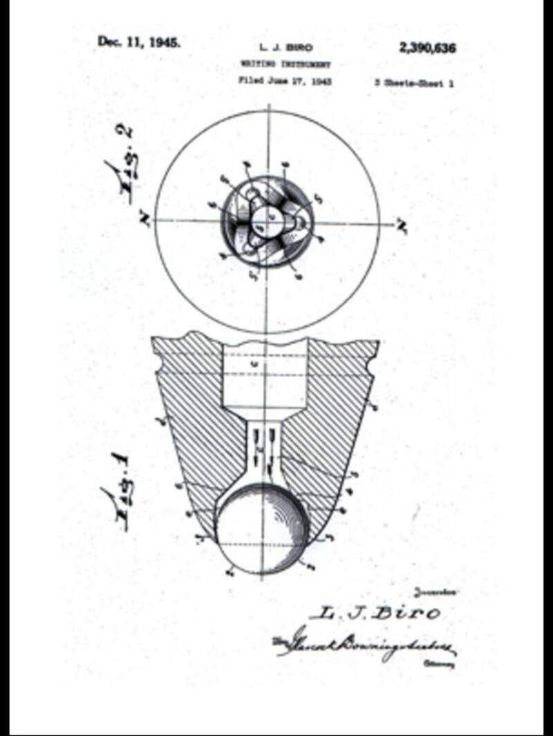 Biró desechó la punta del plumín y en su lugar colocó una pequeña esfera de metal en una de las puntas del tubo. Esta giraría y, por la gravedad, la tinta fluiría hacia el papel secándose en segundos. A su vez, la esfera permitiría que la pluma no se trabara a diferencia de lo que sucedía con la versión que solía utilizar. Trabajó en su nuevo invento junto a su hermano Georg y en 1938 lo patentó para empezar a comercializarlo. No obstante, la guerra complicó sus planes.