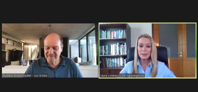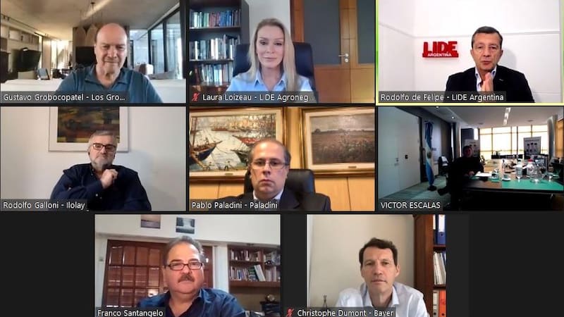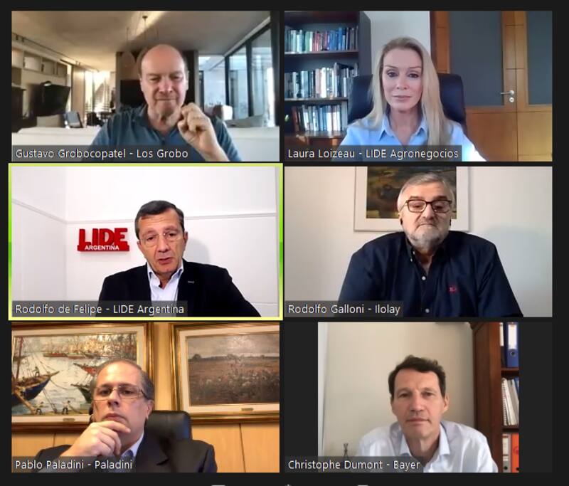 La videoconferencia -en la que se hizo un análisis de los agronegocios- contó con la participación de Gustavo Grobocopatel, CEO de Grupo Los Grobo y presidente de la división LIDE Agronegocios; Cristophe Dumont, presidente y CEO de Bayer Argentina y Cono Sur; Pablo Paladini, director de Frigorífico Paladini; Rodolfo Galloni, gerente General de Ilolay; Franco Santángelo, presidente de Frigorífico Soychú; y Víctor Escalas, presidente de Speed Agro. También estuvieron presentes Laura Loizeau, vicepresidente de LIDE Agronegocios, y Rodolfo de Felipe, presidente de LIDE Argentina, que oficiaron como mediadores.