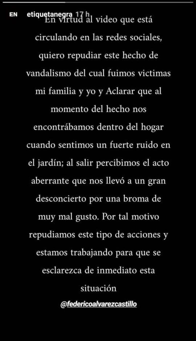 Frente a la repercusión que el video tuvo en Internet, la cuenta en Instagram de Etiqueta Negra publicó una historia con un descargo del empresario: "Quiero repudiar este hecho de vandalismo del cual fuimos víctimas mi familia y yo, y aclarar que en el momento del hecho nos encontrábamos dentro del hogar".