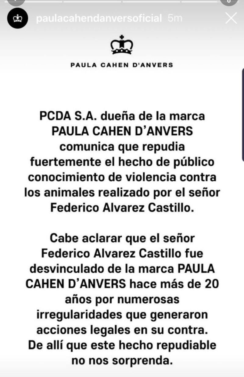 Álvarez Castillo, además,fue fundador con su entonces esposa de Paula Cahen D'Anvers. La marca también utilizó las redes sociales para repudiar el maltrato a los animales y, además, aclarar que el empresario ya no tiene relación con la compañía.