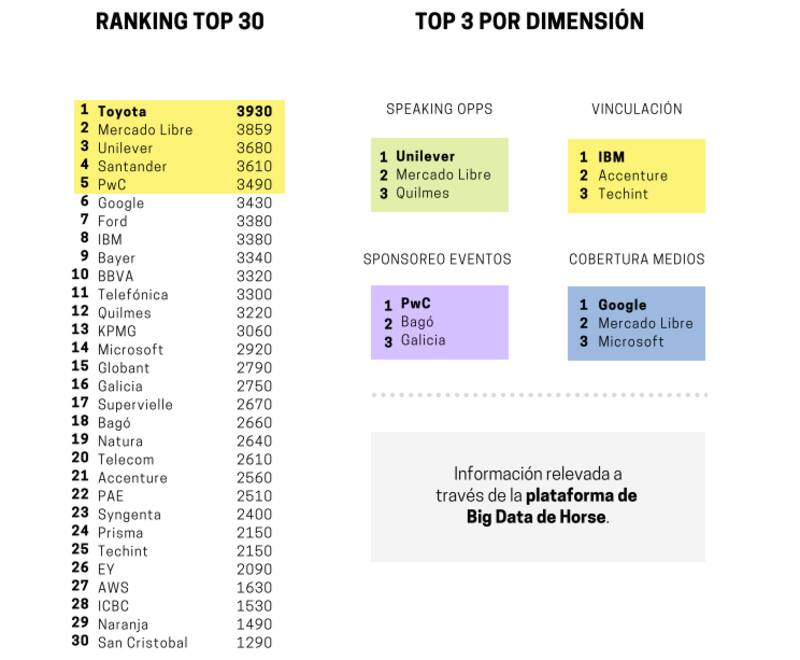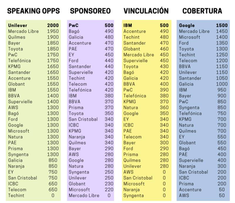 Para formular este ranking, se tuvieron en cuenta cuatro dimensiones: “Speaking Opportunities (participación de ejecutivos de empresas como voceros en eventos empresariales), con Unilever, Mercado Libre y Quilmes liderando este área.