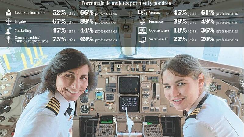El informe de WTW detalla que mientras en la industria general hay 54% de profesionales varones y 46% mujeres, en el sector del transporte aéreo la relación es 65% a 35%. Si, además, se agrega el mercado turístico se observa una ligera mejora hasta el 36% de posiciones ocupadas por ellas.
