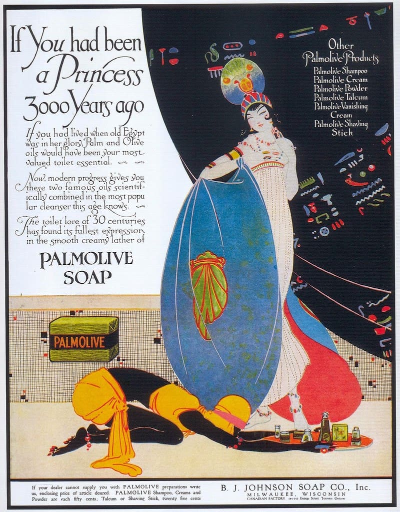 Al principio promocionaban a Palmolive como una antigua receta utilizada por los faraones y figuras de la realeza para sus rituales de baño. Incluso varios de los anuncios presentaban elementos de la cultura egipcia y personajes con rasgos que recordaban a la reconocida Cleopatra. No obstante, Galvanic continuaba siendo el protagonista. Por eso la firma empezó a ofrecer a Palmolive en conjunto con esta marca.