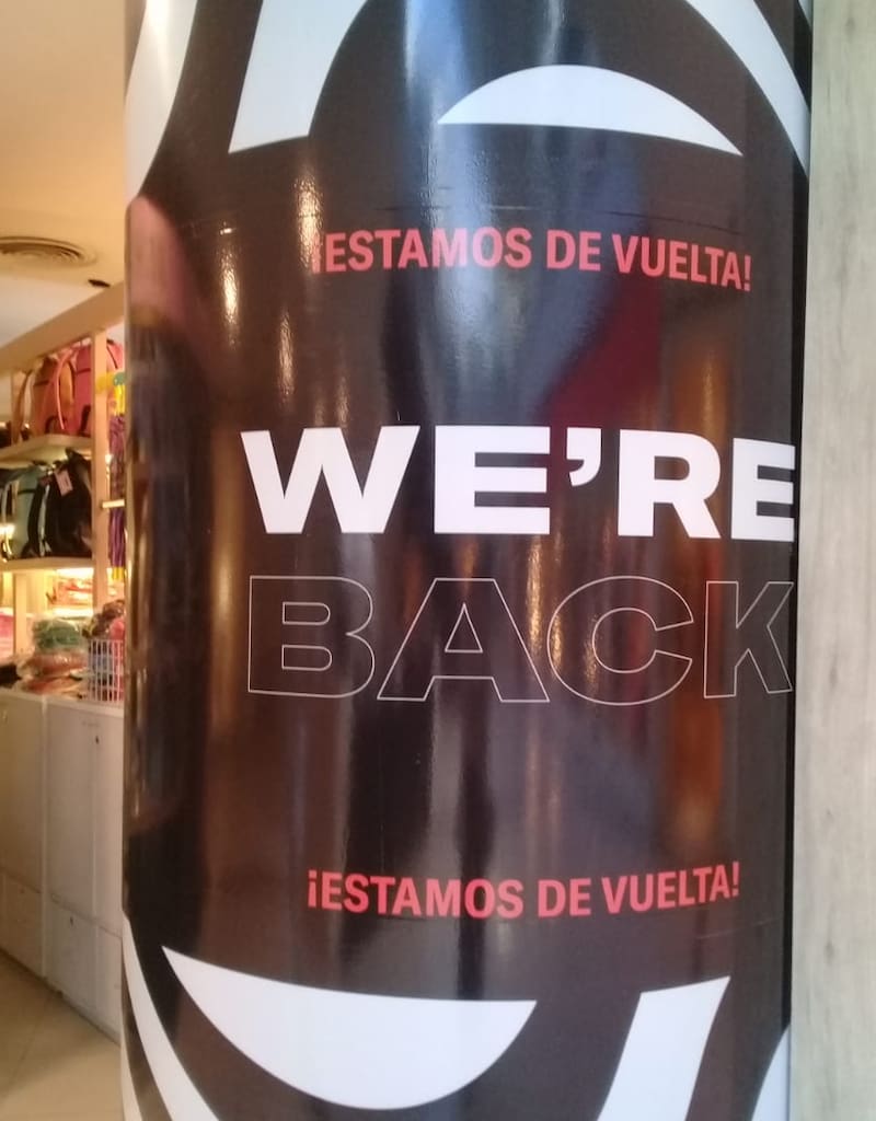 "¡Estamos de vuelta!", reza un cartel pegado en una columna en Alto Palermo