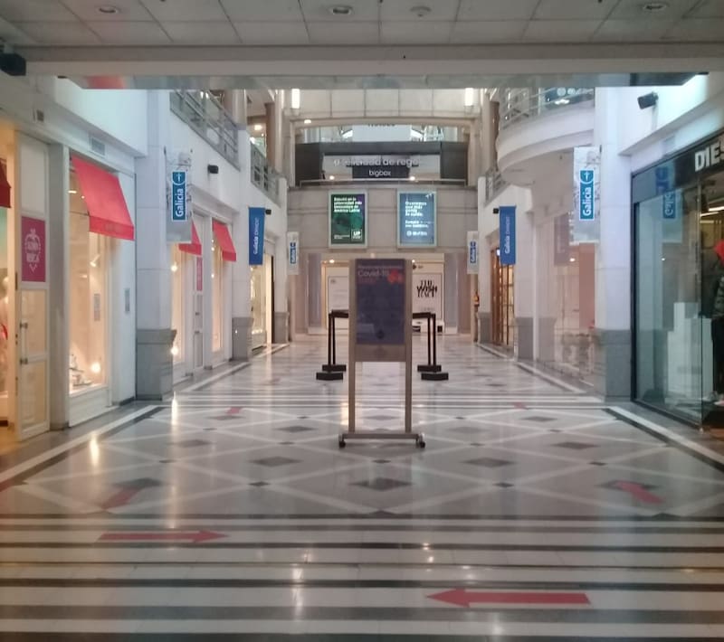 "Espere aquí", "Mantenga la distancia" y "Aguarde a ser llamado por personal del local" son algunas de las instrucciones que los centros comerciales incorporaron en señalizadores y stíckers en forma de círculos pegados en el piso para que los clientes no se amontonen, indicaciones que hoy los guardias de seguridad no debieron recordarles a los visitantes, dada la escasa afluencia de concurrentes.