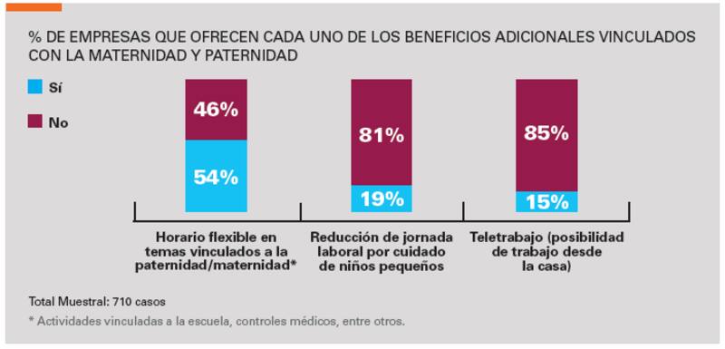 * Un 32% de las empresas no ofrece reducción de horario por lactancia y un 7% solo loofrece hasta los 6 meses de edad del niño o niña. La indica ley argentina (20.744) indica que, durante el período de lactancia, la madre tiene derecho a dos pausas diarias de 30 minutos cada una, por un año posterior al nacimiento.