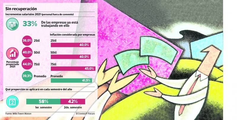 “En realidad, las empresas siempre tratan de que el presupuesto iguale a la inflación; pero, en años anteriores, la inflación se disparó y superó todas las previsiones y los incrementos salariales no pudieron acompañarla, no volvieron a ajustarse , explicó Marcela Angeli, directora de Talento y Compensaciones de Willis Towers Watson. “Si bien para 2021 prevén estar en un nivel similar a la inflación, los salarios no podrán recuperar los puntos perdidos en 2019 ni en este año , aclaró Angeli.