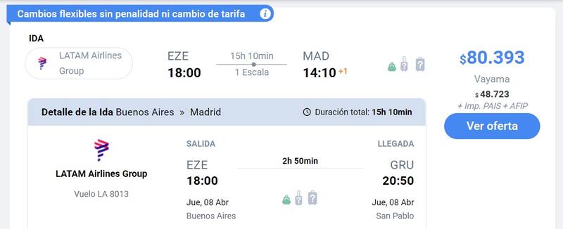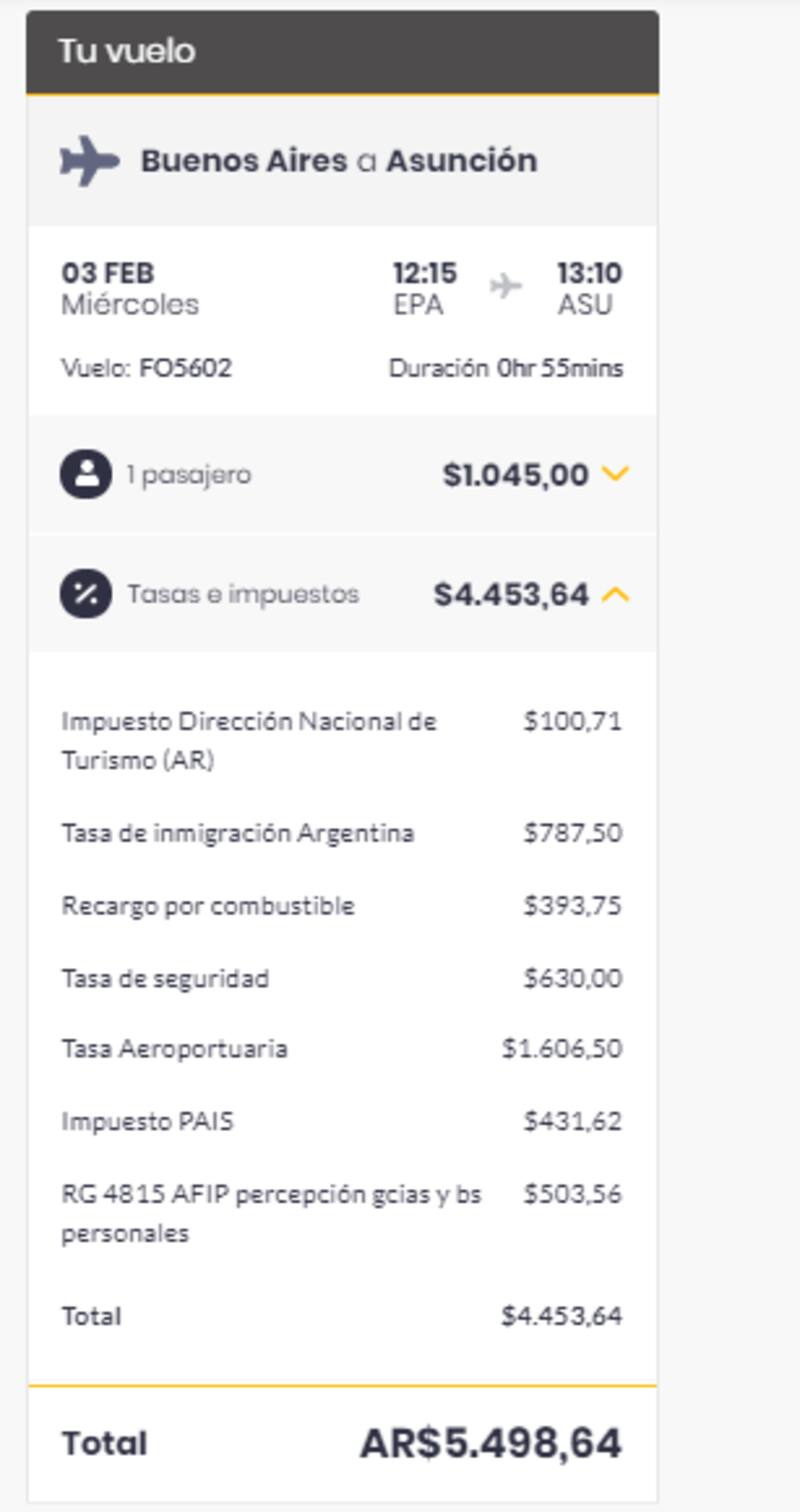 De esta manera, si se desea volar desde Buenos Aires a Asunción el 3 de febrero próximo, por citar un ejemplo, habrá que abonar una tarifa individual de $ 1045, a la que se le suman $ 4453,64 de tasas e impuestos. Entre ellos, ya se incluye el Impuesto País ($ 431,62) y el Régimen de percepción sobre Impuesto a las Ganancias y Bienes Personales (4815 AFIP) ($ 503,56), por lo que el precio final del pasaje asciende a $ 5498,64.