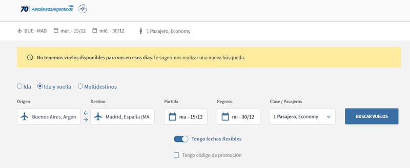 Al ingresar al sitio web de la aerolínea de bandera, si se busca un pasaje a un destino internacional para las próximas semanas, aparece un mensaje que advierte: “No tenemos vuelos disponibles para vos en esos días. Te sugerimos realizar una nueva búsqueda .