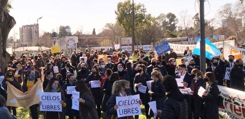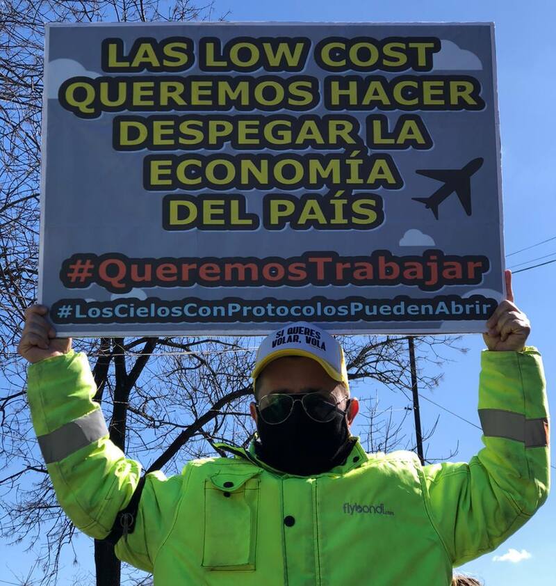 Con pancartas y eslóganes como "Las low-cost queremos hacer despegar la economía del país", "Queremos trabajar" y "Los cielos con protocolos pueden abrir", 1500 trabajadores de ambas empresas entre empleados de las oficinas, pilotos y tripulantes, se reunieron para visivilizar su reclamo, acompañados de vecinos de la zona, que se sumaron a la medida.