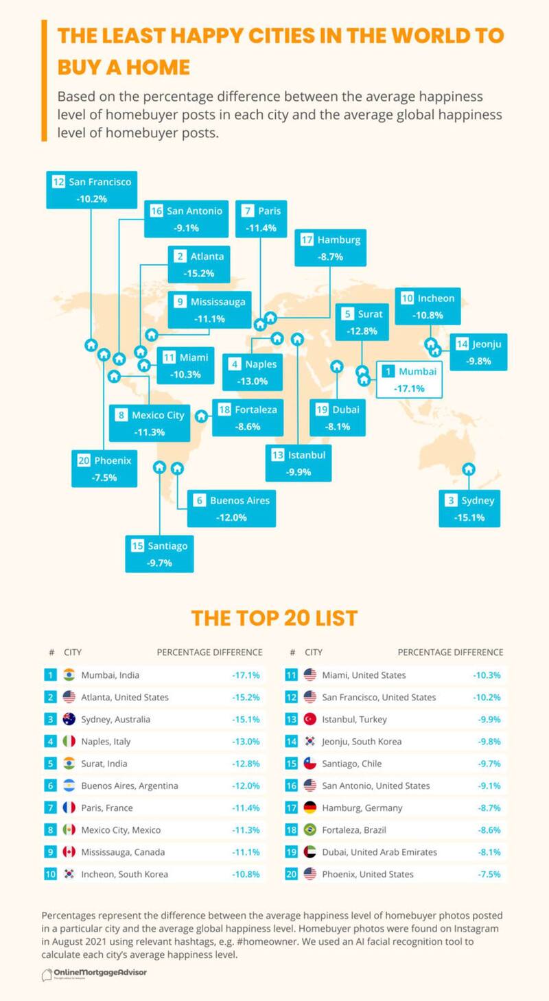 En cuanto a la lista general, según compartió la empresa Buenos Aires es la sexta ciudad más infeliz del mundo, mientras que el primer puesto lo ocupa Bombay, India, donde la gente que compra una casa nueva suele ser un 17,1% más triste que el promedio mundial.