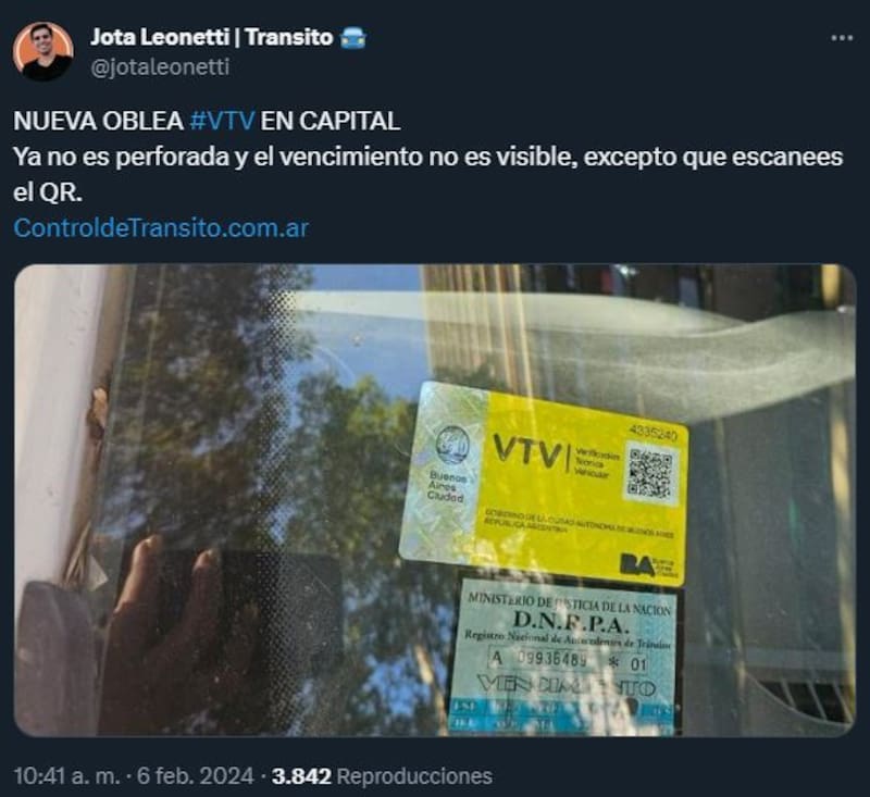 La Ciudad de Buenos Aires comenzó a entregar nuevas obleas a los automovilistas que realizan la Verificación Técnica Vehicular (VTV). Se trata del nuevo comprobante visible que debe ir pegado en el parabrisas del auto y que cuenta con un código QR con la información correspondiente.