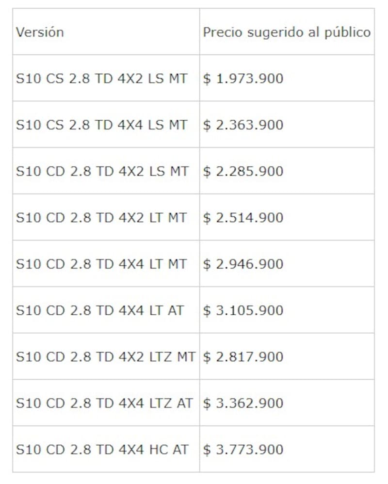 La Nueva S10 se ofrece en dos opciones de carrocería (doble cabina y cabina simple), cuatro niveles de equipamiento (LS, LT, LTZ y High Country) y llega disponible en los colores exteriores Blanco Summit, Gris Sun of a Gun, Plata Switchblade, Negro Black Meet Kettle y los nuevos Gris Dark Shadow y Azul Darkmoon.