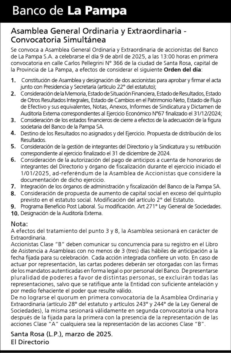 Nota: A efectos del tratamiento del punto 3 y 8, la Asamblea sesionará en carácter de Extraordinaria. Accionistas Clase "B" deben comunicar su concurrencia para su registro en el Libro de Asistencia a Asambleas con no menos de 3 (tres) dlas hábiles de anticipación a la fecha fijada para su celebración. Cada acción integrada confiere un voto. En caso de actuar por representación, las cartas poderes deberán ser otorgadas con las firmas de los mandatos autenticadas en forma legal o por personal del Banco. De presentarse pluralidad de poderes a favor de distintas personas, se excluirán todas las representaciones, salvo que se ratifique ante la Entidad con suficiente antelación y por medio fehaciente el poder que resulte válido. De no lograrse el quorum en primera convocatoria de la Asamblea Ordinaria y Extraordinaria (articulo 28º del estatuto y artlculos 243º y 244º de la Ley General de Sociedades), la misma sesionará válidamente en segunda convocatoria una hora después de la fijada para la primera con la presencia de la representación de las acciones Clase "A" cualquiera sea la representación de las acciones Clase "B". Santa Rosa (L.P.), marzo de 2025. El Directorio