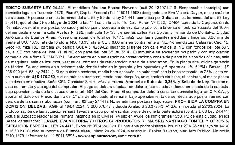 EDICTO SUBASTA LEY 24.441. El martillero Mariano Espina Rawson, (cuit 20-13407112-6. Responsable Inscripto) con domicilio legal en Tucumán 1679, Piso 5°, Capital Federal (Tel: 115011.3598) designado por Eva Victoria Dayan , en su carácter de acreedor hipotecario en los términos del arto 57 y 59 de la ley 24.441 , comunica por 3 días en los términos del art. 57 Ley 24.441 , que el día 29 de Mayo de 2024, a las 11 hs. en la calle Tte. Gral Perón N° 1233, CABA -sede de la Corporación de Rematadores-, al mejor postor, contado y ad corpus procederá ante escribano público, a la venta en pública subasta del 1 00% del inmueble sito en la calle Avalos N° 285, matrícula 15-7284, entre las calles Paz Soldan y Fernando de Montalvo, Ciudad Autónoma de Buenos Aires. Posee una superficie total de 164,15 mts2, con las siguientes medidas y linderos: 8,66 mts de frente al SO, 18,98 mts de fondo al NO, 18,93 mts al SE y 8,66 mts en contrafrente al NE. Nomenclatura Catastral: Circo 15, Secc 49, mza 18B, parcela 24, partida GCBA 314269-02, lindando al frente con calle Avalos, al NO con fondos del lote 33 y 34, al SE con parte del lote 31, al NE con parte del lote 35 (fs. 6/14 ). El inmueble se encuentra ocupado y con explotación comercial de la firma ROMA S.R.L. Se encuentra en buen estado de conservación y consta de planta baja con dos oficinas, sala de máquinas, sala de insumos, vestuarios, cámaras de refrigeración y sala de elaboración. En la planta alta, oficina gerencia de fábrica. Se encuentra en funcionamiento donde trabajan la gerente y los operarios y 5 operarios (fs. 51 /54). Base: U$S 235.000.(art. 58 ley 24441). Si no hubiese postores, media hora después, se subastará con la base retasada un 25%., esto es, en la suma de U$S 176.250, y si no hubiese postores, media hora después, se subastará sin base, al contado, al mejor postor yen dinero en efectivo. Seña 30%, Comisión 3 % + IVA si la misma. Arancel de Subasta: 0,25% y Sellado de Ley. Todo en el acto del remate y a cargo del comprador. El pago se deberá efectuar en dólar billete estadounidense en el acto de la subasta, bajo apercibimiento de lo dispuesto en el art. 584 del Codo Proc. El comprador deberá constituir domicilio legal en CABA, y abonar el Saldo de Precio dentro del 5° día de efectuado el remate, bajo apercibimiento de ser declarado postor remiso con pérdida de las sumas abonadas (conf. arto 62 Ley 24441). No se admiten posturas bajo sobre. PROHIBIDA LA COMPRA EN COMISiÓN. DEUDAS: AGIP al 19/04/2024 , $ 886.378,47 Y deuda Avaluo $ 28.372,43, AYSA: sin deuda al 22/03/2024. La protocolización de las actuaciones será llevada a cabo por el escribano que designe la parte aclora (conf. arto 63 Ley 24.441) Actúa el Juzgado Nacional de Primera Instancia en lo Civil N° 74 sito en AV.de los Inmigrantes 1950, PB de esta ciudad, en los Autos EJECUCION ESPECIAL LEY 24.441", Expte.N° 052468/2020. El inmueble podrá visitarse los dlas 27 y 28 de Mayo de 14:30 a 16:30 hs. Ciudad Autónoma de Buenos Aires, Mayo 20 de 2024. Mariano M. Espina Rawson , Martillero Público. Matrícula F01 O, L079. Informes: tel. 11 5011.3598 - www.espinarawsonyasoc.com.ar.