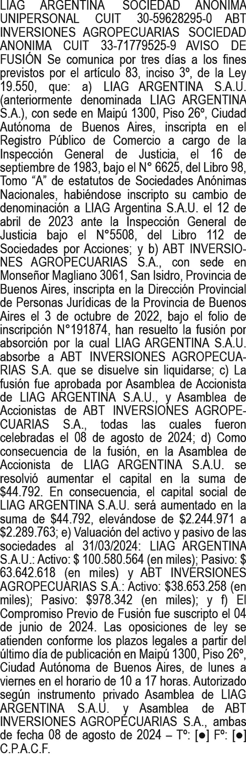 LIAG ARGENTINA SOCIEDAD ANONIMA UNIPERSONAL CUIT 30-59628295-0 ABT INVERSIONES AGROPECUARIAS SOCIEDAD ANONIMA CUIT 33-71779525-9 AVISO DE FUSIÓN Se comunica por tres días a los fines previstos por el artículo 83, inciso 3°, de la Ley 19.550, que: a) LIAG ARGENTINA S.A.U.(anteriormente denominada LIAG ARGENTINA S.A.), con sede en Maipú 1300, Piso 26°, Ciudad Autónoma de Buenos Aires, inscripta en el Registro Público de Comercio a cargo de la Inspección General de Justicia, el 16 de septiembre de 1983, bajo el Nº 6625, del Libro 98 Tomo "A" de estatutos de Sociedades Anónimas Nacionales, habiéndose inscripto su cambio de denominación a LIAG Argentina S.A.U. el 12 de abril de 2023 ante la Inspección General de Justicia bajo el N°5508, del Libro 112 de Sociedades por Acciones; y b) ABT INVERSIONES AGROPECUARIAS S.A., con sede en Monseñor Magliano 3061, San Isidro, Provincia de Buenos Aires, inscripta en la Dirección Provincial de Personas Jurídicas de la Provincia de Buenos Aires el 3 de octubre de 2022, bajo el folio de inscripción N°191874, han resuelto la fusión por absorción por la cual LIAG ARGENTINA S.A.U. absorbe a ABT INVERSIONES AGROPECUARIAS S.A. que se disuelve sin liquidarse; c) La fusión fue aprobada por Asamblea de Accionista de LIAG ARGENTINA S.A.U. , y Asamblea de Accionistas de ABT INVERSIONES AGROPECUARIAS S.A., todas las cuales fueron celebradas el 08 de agosto de 2024; d) Como consecuencia de la fusión, en la Asamblea de Accionista de LIAG ARGENTINA S.A.U. se resolvió aumentar el capital en la suma de $ 44.792. En consecuencia, el capital social de LIAG ARGENTINA S.A.U. será aumentado en la suma de $ 44.792, elevándose de $ 2.244.971 a $ 2.289.763; e) Valuación del activo y pasivo de las sociedades al 31/03/2024: LIAG ARGENTINA S.A.U. : Activo: $ 100.580.564 (en miles); Pasivo: $ 63.642.618 (en miles) y ABT INVERSIONES AGROPECUARIAS S.A.: Activo: $ 38.653.258 (en miles); Pasivo: $ 978.342 (en miles); y f) El Compromiso Previo de Fusión fue suscripto el 04 de junio de 2024. Las oposiciones de ley se atienden conforme los plazos legales a partir del último día de publicación en Maipú 1300, Piso 26° Ciudad Autónoma de Buenos Aires, de lunes a viernes en el horario de 10 a 17 horas. Autorizado según instrumento privado Asamblea de LIAG ARGENTINA S.A.U. y Asamblea de ABT INVERSIONES AGROPECUARIAS S.A., ambas de fecha 08 de agosto de 2024 - T': [•] Fº: [•] C.P.A.C.F.