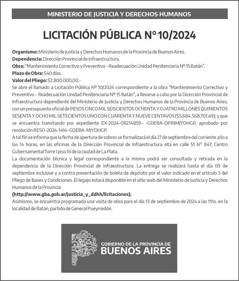 MINISTERIO DE JUSTICIA Y DERECHOS HUMANOS LICITACIÓN PÚBLICA Nº 10/2024 Organismo: Ministerio de Justicia y Derechos Humanos de la Provincia de Buenos Aires. Dependencia: Dirección Provincial de Infraestructura. Obra: "Mantenimiento Correctivo y Preventivo - Readecuación Unidad Penitenciaria Nº 15 Batán". Plazo de Obra: 540 días. Valor del Pliego: $ 2.800.000,00.- Se abre el llamado a Licitación Pública Nº 10/2024 correspondiente a la obra "Mantenimiento Correctivo y Preventivo - Readecuación Unidad Penitenciaria Nº 15 Batán", a llevarse a cabo por la Dirección Provincial de Infraestructura dependiente del Ministerio de Justicia y Derechos Humanos de la Provincia de Buenos Aires, con un presupuesto oficial de PESOS CINCO MIL SEISCIENTOS OCHENTA Y CUATRO MILLONES QUINIENTOS SESENTA Y OCHO MIL SETECIENTOS UNO CON CUARENTA Y NUEVE CENTAVOS ($5.684.568.701,49); y que se encuentra tramitando por expediente EX-2024-08214859- -GDEBA-DPINMJYDHGP, aprobado por resolución RESO-2024-1414-GDEBA-MJYDHGP. A tal fin se informa que la fecha de apertura de sobres se formalizará el día 27 de septiembre del corriente año a las 14 horas, en las oficinas de la Dirección Provincial de Infraestructura sita en calle 51 Nº 847, Centro Gubernamental Torre I piso16de la ciudad de La Plata. La documentación técnica y legal correspondiente a la misma podrá ser consultada y retirada en la dependencia de la Dirección Provincial de Infraestructura. La entrega se realizará hasta el día 09 de septiembre inclusive y a contra presentación de boleta de depósito por el valor indicado en el artículo 3 del Pliego de Bases y Condiciones. El legajo estará disponible en el sitio web del Ministerio de Justicia y Derechos Humanos de la Provincia (http://www.gba.gob.ar/justicia_y_ddhh/licitaciones). Asimismo, se encuentra programada una visita de obra para el día 13 de septiembre de 2024 a las 11 hs. en la localidad de Batán, partido de General Pueyrredón.