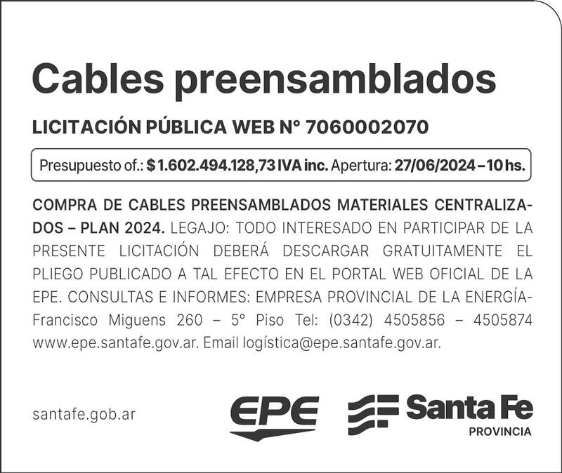Cables preensamblados LICITACiÓN PÚBLICA WEB N° 7060002070 Presupuesto 01.: $1.602.494.128,73 IV A ¡ne. Apertura: 27/06/2024 -10 hs. COMPRA DE CABLES PREENSAMBLADOS MATERIALES CENTRALIZADOS - PLAN 2024. LEGAJO: TODO INTERESADO EN PARTICIPAR DE LA PRESENTE LICITACiÓN DEBERÁ DESCARGAR GRATUITAMENTE EL PLIEGO PUBLICADO A TAL EFECTO EN EL PORTAL WEB OFICIAL DE LA EPE. CONSULTAS E INFORMES: EMPRESA PROVINCIAL DE LA ENERGíA Francisco Miguens 260 - 5° Piso Tel: (0342) 4505856 - 4505874 www.epe.santafe.gov.ar. Emaillogística@epe.santafe.gov.ar. santafe.gob.ar EPE Santa Fe PROVINCIA