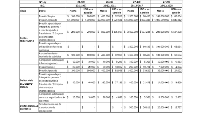 Curiosamente, un análisis histórico revela una paradoja financiera: si bien los montos aumentaron nominalmente en pesos en un 100.000% respecto a normativas anteriores, su conversión a dólares al momento de sanción demuestra que el valor real de punibilidad es actualmente menor en moneda dura (pasando de USD 100.000 en 1997 a USD 68.634 con la nueva ley).