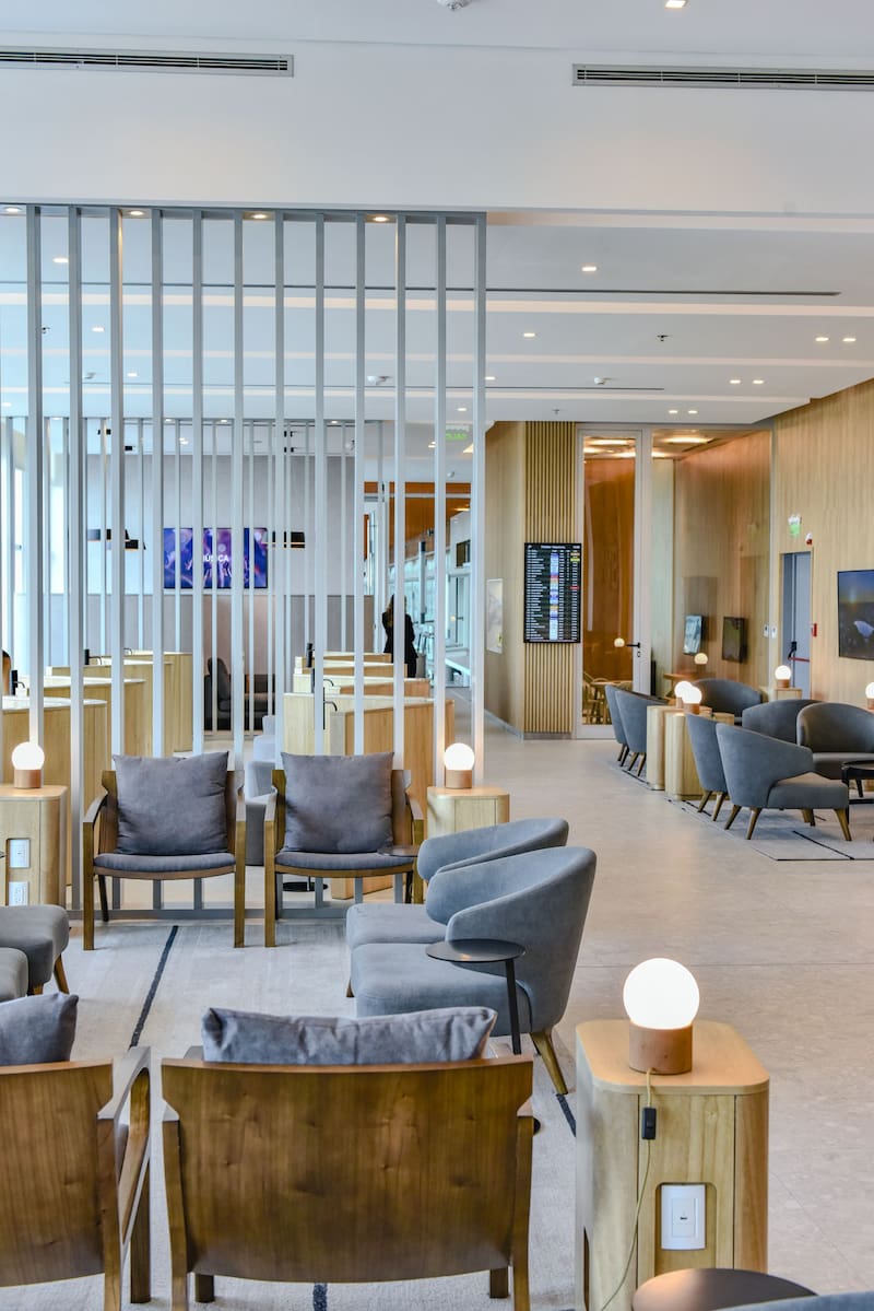La sala está ideada para que los clientes puedan relajarse y tener un espacio privado y cómodo antes de comenzar su viaje. Cuenta con un amplio living con sillones, un espacio de coworking para quienes viajan por negocios o trabajo y un área infantil para que los más chicos puedan disfrutar de una sala de recreación. ¿El plus? La oferta gastronómica es de primera calidad y sin costo alguno. También cuenta con vestuarios con duchas y lockers, un espacio de carga de dispositivos para todos los formatos y Wifi libre.
