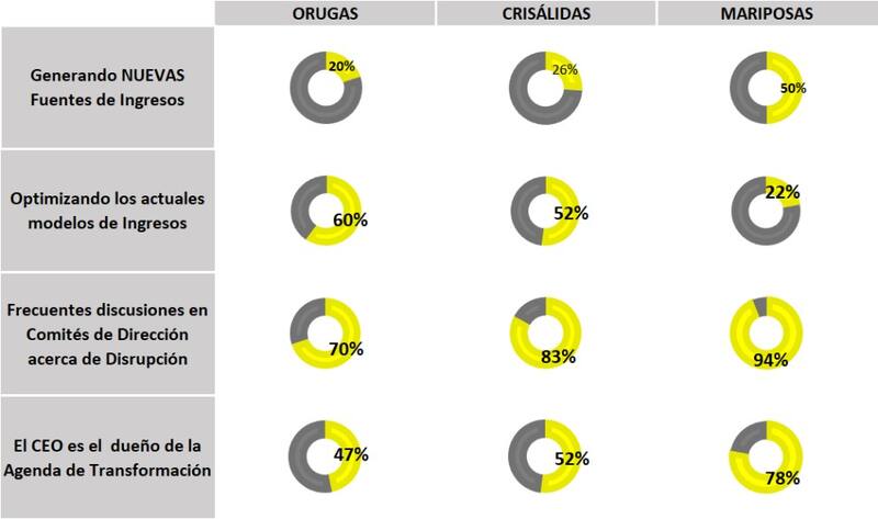 El tercer grupo es aquel cuyas organizaciones son capaces de liderar la disrupción, y son identificadas como Mariposas. Se trata de compañías que han experimentado una transformación empresarial en respuesta a factores externos urgentes, emergiendo con nuevas capacidades para impulsar el crecimiento y la competitividad en un mundo digital. Además, han internalizado la urgencia de la disrupción y han superado la inercia del éxito actual para transformar sus negocios con el objetivo de aprovechar las ventajas. Este tipo de empresas muestran un conjunto de características y comportamientos que las distinguen. Su diferencia subyacente es el espíritu de ser disruptivo en lugar de simplemente hacer innovación. Lo hacen cambiando sus carteras de productos y servicios y/o revisando los modelos de negocios actuales; creando una cultura de ser los primeros en moverse; mirando más allá de su sector para fomentar asociaciones entre industrias y sectores; transformando modelos de talentos, contratación en diversas industrias para la diversidad cognitiva y el emprendedurismo; creando unidades de innovación dedicadas, ayudadas con coaching jerárquico.