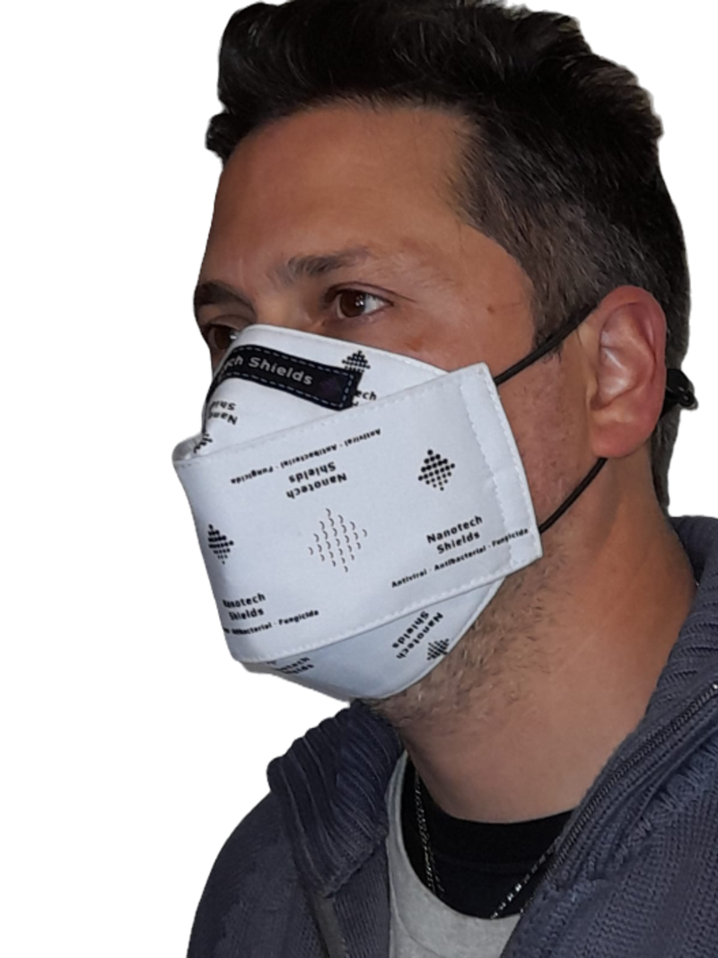 La mascarilla Nanotech Shields 7.3 tiene dos tipos de protección: por escudo, como los barbijos tradicionales, y por eliminación mediante la nanotecnología. La sigla 7.3 describe las 7 capas de protección aplicadas a las 3 telas físicas.