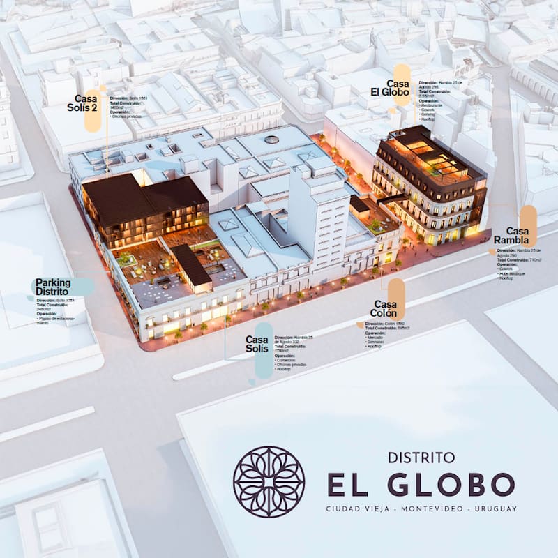 Por otro lado, el Globo District, ubicado en la Ciudad Vieja de Montevideo, se centra en negocios, servicios y bienes raíces. Con una inversión de aproximadamente 26 millones de dólares, consta de seis edificios que formarán un polo de negocios integrando innovación, arte y tecnología.