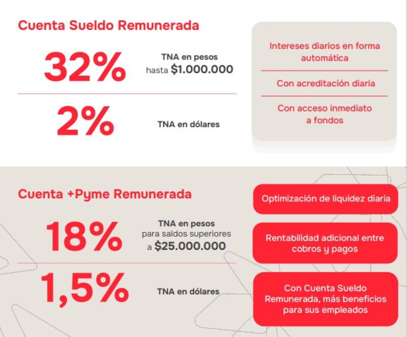 Por su parte, las pequeñas y medianas empresas también se benefician con esta propuesta. La Cuenta +Pyme Remunerada ofrece una rentabilidad del 18% TNA en pesos para saldos superiores a $25.000.000 y un 1,5% TNA en dólares.