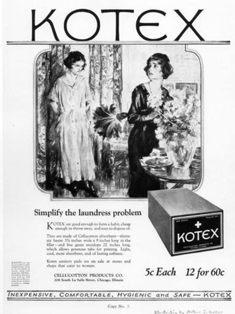 Ya en 1920, Kimberly-Clark lanza al mercado Kotex, un nombre pensado para hacer referencia a un producto que en aquella época era considerado tabú, formado por la combinación de las palabras "algodón" y "textura" (en inglés Kotton & Texture). Cambiando por completo la forma de comunicar, tan solo un año más tarde, en 1921 Kotex había logrado comercializar con éxito la primera toalla sanitaria para consumo masivo.