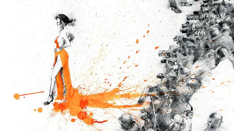 Los famófagos no admiran al famoso, lo devoran. Me interesa mostrar cómo ese momento tan glamoroso y consagratorio puede convertirse en una trampa de tropezones y vestidos que se desgarran. A través de mis dibujos intento expresar esa tensión que existe entre la magia de la fama y las cámaras, y la violencia de una jauría de fans.