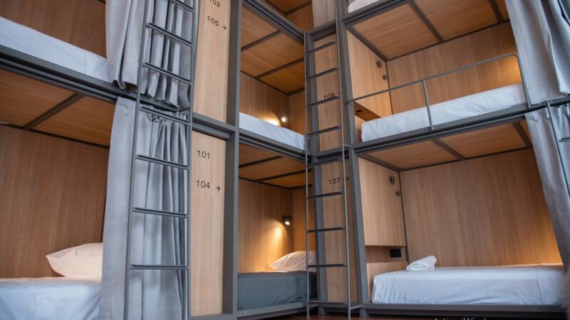 El hostel posee 4 habitaciones comunitarias mixtas con camas cápsula súper size, tres de ellas tienen habitaciones con una capacidad para 8 huéspedes y la otra para 9 personas.