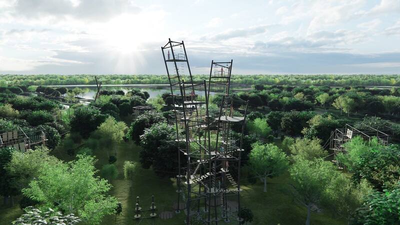 Según publicó Forbes, que tuvo un adelanto exclusivo sobre cómo será el nuevo parque, el campo de aventuras aéreas será su principal atracción: tendrá tres torres para escalar, una de ellas imitación de la famosa torre Sears de 12 pisos de altura.