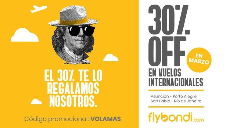 Por el otro, la low cost Flybondi -que opera desde el aeropuerto de El Palomar- activó durante toda esta semana una promoción para todos sus destinos internacionales. Ofrecerá un 30% off para viajar a Río de Janeiro, San Pablo, Porto Alegre y Asunción entre los meses de marzo a junio.