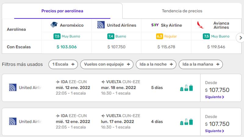 De acuerdo a las opciones de vuelo que arroja la firma Despegar.com, el trayecto Ezeiza - Cancún por cinco días, ida y vuelta, cuenta con un precio base de $ 107.750.