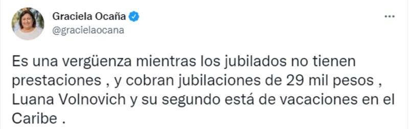 En cambio, desde la oposición las críticas fueron muy duras. "Es una vergüenza mientras los jubilados no tienen prestaciones, y cobran jubilaciones de 29 mil pesos, Luana Volnovich y su segundo están de vacaciones en el Caribe", acusó la diputada nacional de Cambiemos, Graciela Ocaña, en Twitter.