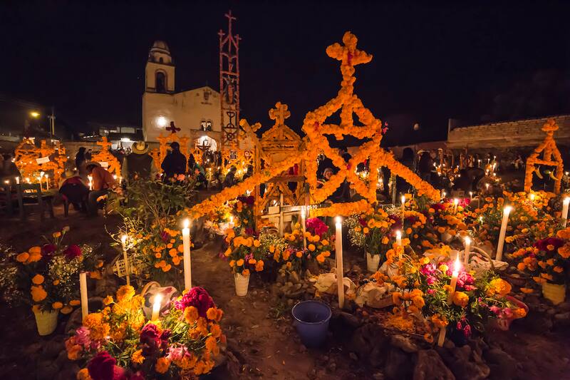 Según la tradición mexicana, durante el Día de los Muertos las ánimas regresan a casa para convivir con sus parientes, que les preparan ofrendas con fotos, coloridas guirnaldas con flores de cempasúchil, sus bebidas y alimentos preferidos, además del pan de muerto.