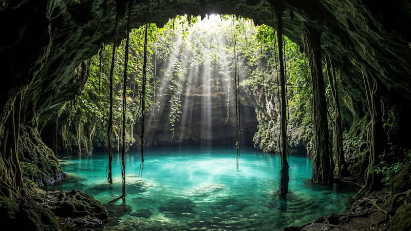 Los cenotes son pozos naturales de agua dulce, profunda y extremadamente transparente, formados por la erosión de la roca caliza que crea cavernas inundadas conectadas a ríos subterráneos.
