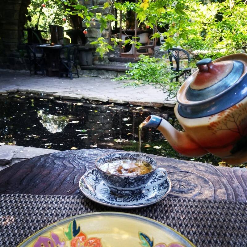 Entrar en esta cabaña escondida en medio del bosque, es lo más parecido a sumergirte en un cuento. La madera, las piedras, el estanque con peces carpa, los juegos de té, todos diferentes entre sí, la chimenea, las flores. Todo está puesto con mucho amor y pasión por el té.
