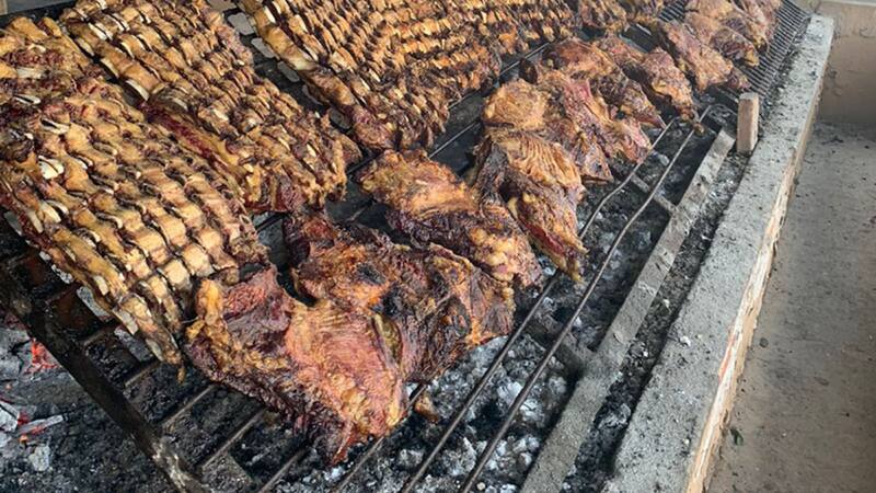 El menú también es de tenedor libre con pastas caseras, embutidos y encurtidos, distintos cortes de asado de vaca o cerdo para finalizar con postres clásicos como duraznos naturales, zapallos en almíbar y flan.