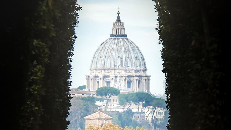 Al mirar por la pequeña cerradura, la perspectiva se alinea de forma perfecta para enmarcar la cúpula de San Pedro, rodeada por un túnel natural de laureles. La escena genera un efecto “telescopio” que hace que la cúpula parezca más grande y cercana.