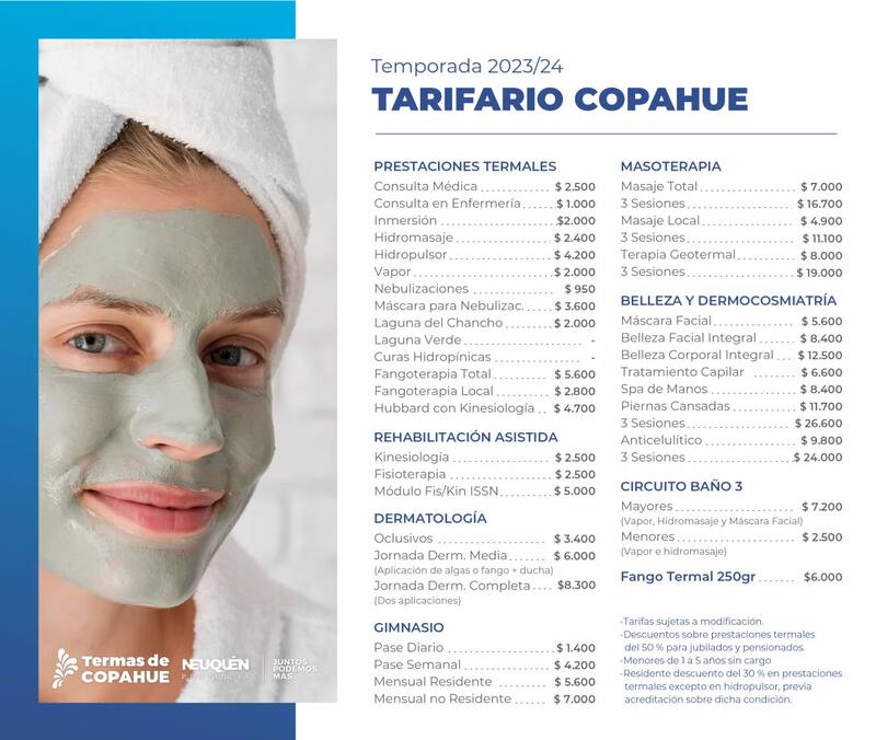 Este tesoro termal brinda servicios médicos y de enfermería, incluyendo exámenes físicos previos al ingreso a las Termas de Copahue. Sus baños termales son una sesión de terapia; hidromasajes con agua de volcán y masoterapia.