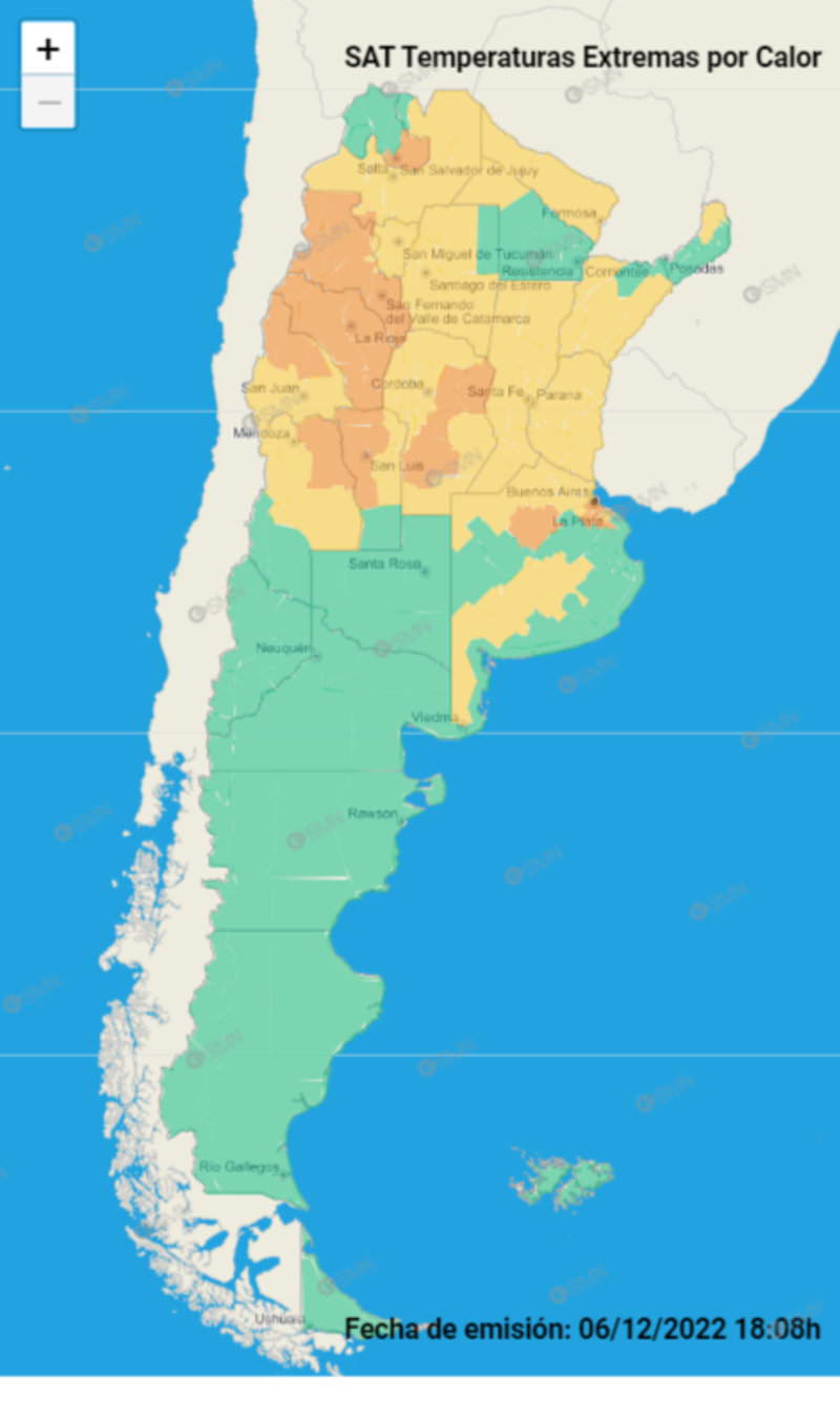 - Alerta Naranja: sur de Jujuy, Catamarca, La Rioja, norte de San Juan, este de Mendoza, oeste de San Luis, parte de Córdoba y algunos sectores de Buenos Aires.