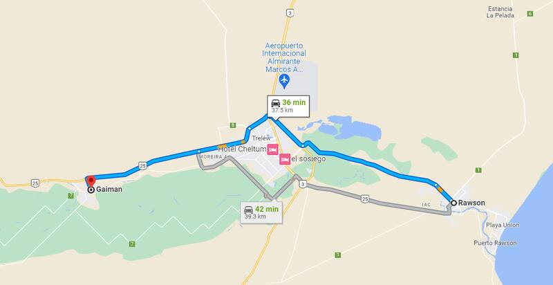 El viaje, que dura aproximadamente 35 minutos, se realiza tomando la Avenida 9 de julio hasta conectar con la Ruta Nacional 3, llamada Comandante Luis Piedrabuena, y luego desviándose por la Ruta Nacional 25.