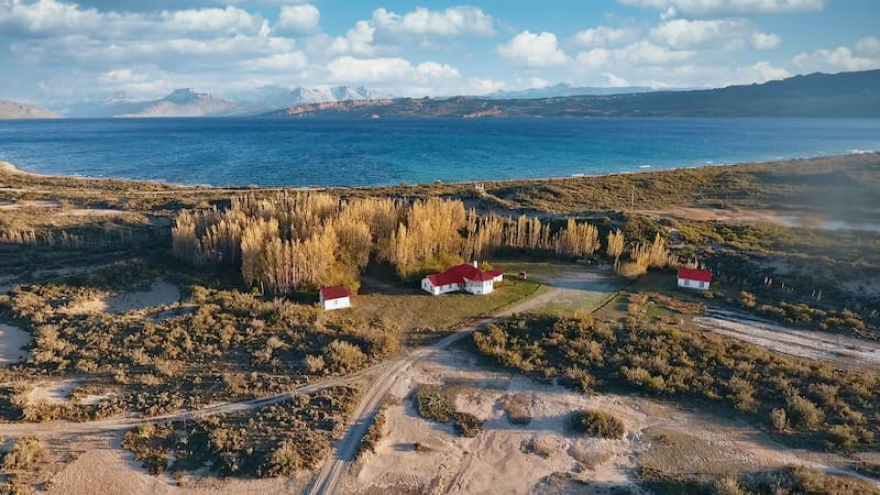 Ubicada a 97 kilómetros de la ruta 40 y a 30 km de la frontera con Chile por el Paso Roballos, la hostería se encuentra en una posición natural privilegiada, entre el azul del Lago Pueyrredón y el turquesa del Lago Posadas.
